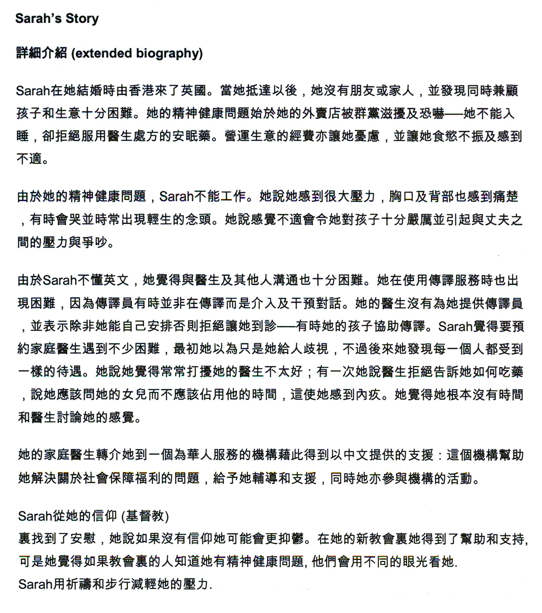 Sarah came to the UK from Hong Kong when she got married. When she arrived she had no friends or family here and found it difficult balancing looking after her children and business. Her mental health problems began when her takeaway business was harassed and threatened by gangsters - she stopped sleeping but felt reluctant to take sleeping tablets that the doctor gave her. The costs of running the business also caused her concern and made her lose her appetite and feel unwell.