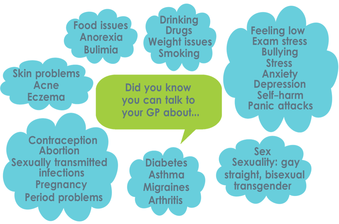 Mental health, exams, smoking, alcohol, drugs, and relationships worry young people. GPs should have leaflets about the range of emotional problems they can help with.