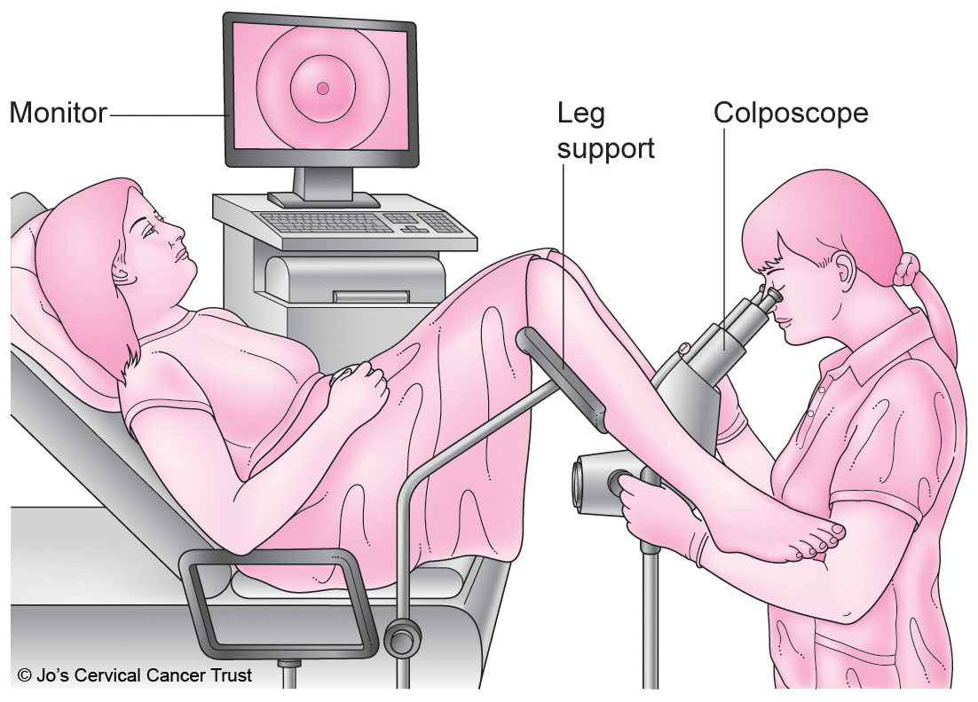The examination is similar to a cervical screening test, but it involves a more detailed look at the cervix. A speculum is placed into the vagina to open it, and a magnifying device, the colposcope, is used to examine the cervix and see the area of abnormal cells more clearly. The colposcope does not go into your body.