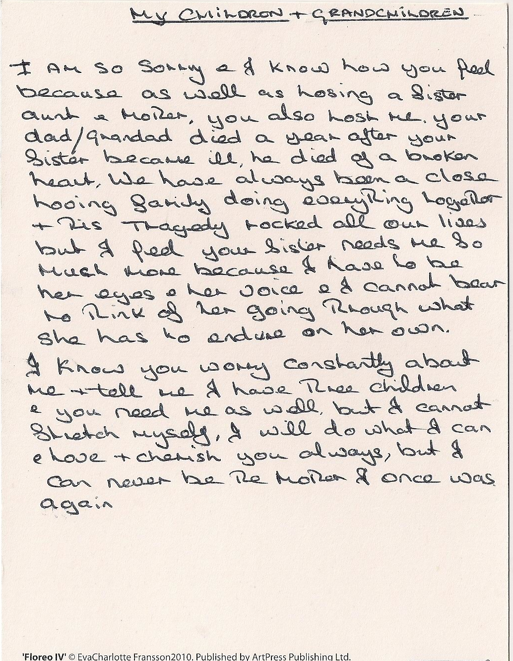 We asked people we interviewed to write a message on a postcard to a person of their choice. One chose to write a message to the rest of the family. It sums up her feelings about balancing her different roles as a mother and grandmother now she is caring for her severely brain injured daughter. She apologises for not being there for the rest of the family but ‘your sister needs me … I have to be her eyes and her voice’.